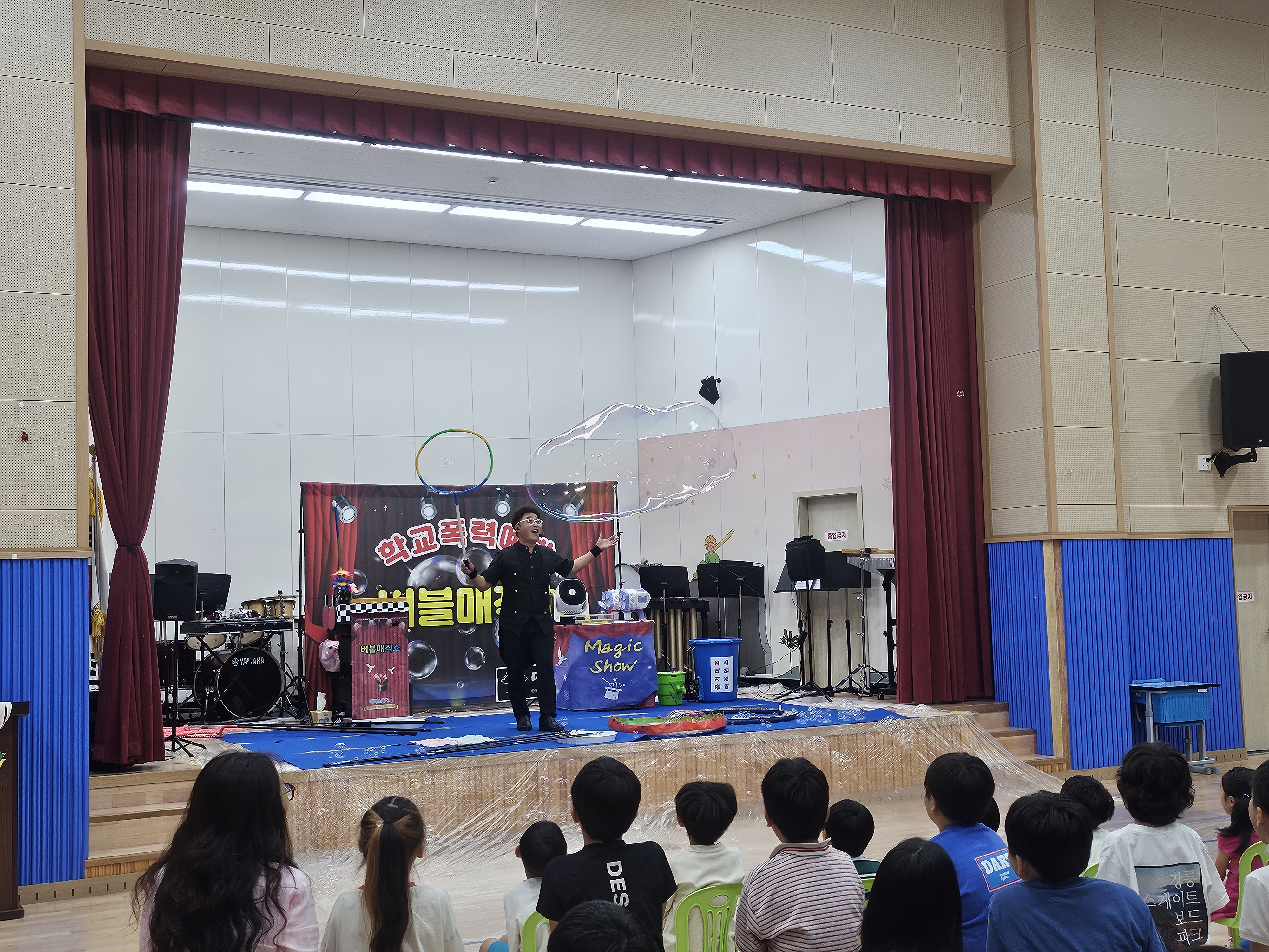 공연은 학교폭력예방 오프닝 버블매직쇼 공연으로 시작되었습니다. 버블아티스트의 화려한 버블매직쇼와 마술쇼가 학생들의 시선을 단번에 사로잡았고, 재미와 놀라움을 동시에 선사하며 학생들의 집중력을 높였습니다. 오프닝 공연이 끝난 후에는 학교폭력에 대한 강의가 이어졌습니다.