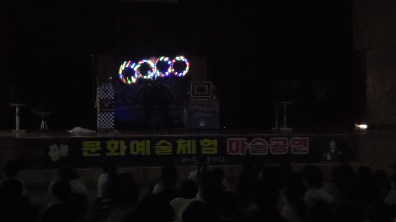 마지막으로 엔딩 공연은 강당 전체의 조명을 소등한 후 착시 마술, 옵티컬일루전링으로 마무리되었습니다. 어둠 속에서 반짝이는 옵티컬링이 만들어내는 환상적인 장면은 공연의 대미를 장식하기에 충분했습니다. 학생들은 입을 다물지 못했고, 선생님들도 모두 박수와 환호를 보냈습니다.