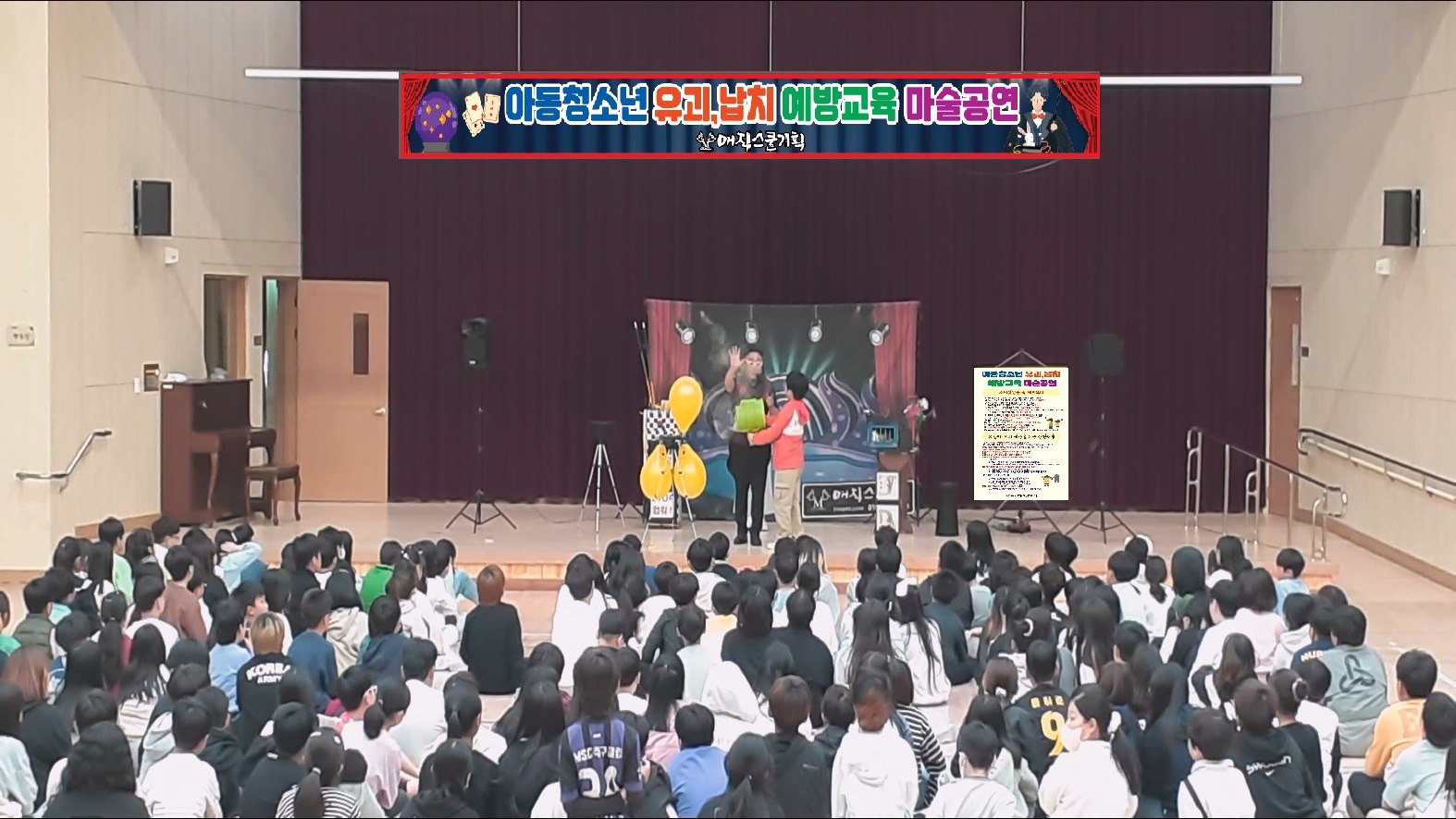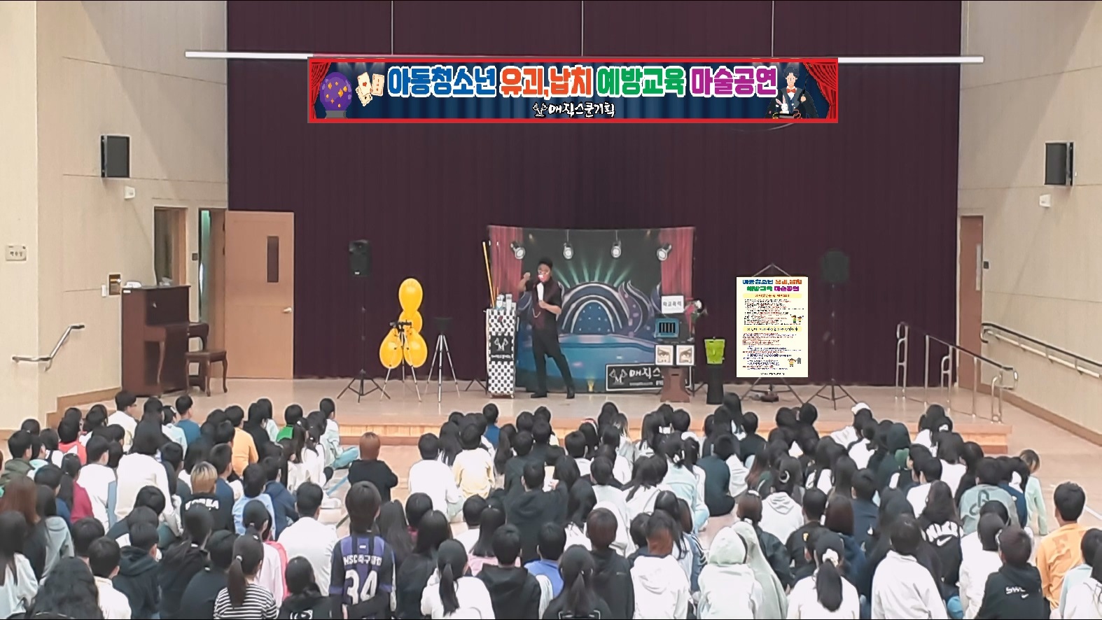 오늘 서울특별시 00초등학교 강당에서는 특별한 유괴,납치 예방교육 마술공연이 열렸습니다. 전교생을 대상으로 한 이번 행사는 학생들과 교사 모두에게 큰 호응을 받으며 성공적으로 마무리되었습니다.