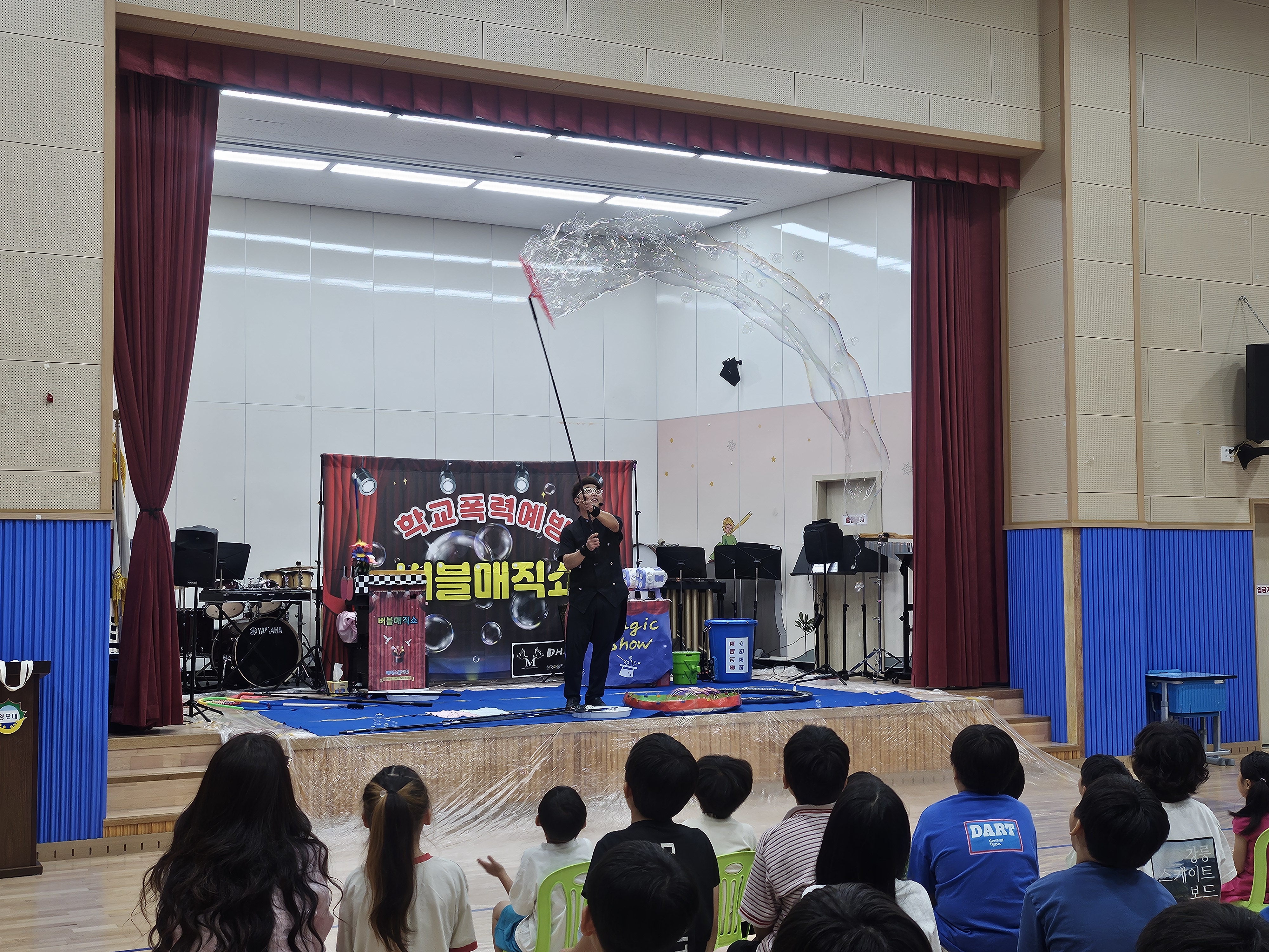 공연은 학교폭력예방 오프닝 버블매직쇼 공연으로 시작되었습니다. 버블아티스트의 화려한 버블매직쇼와 마술쇼가 학생들의 시선을 단번에 사로잡았고, 재미와 놀라움을 동시에 선사하며 학생들의 집중력을 높였습니다. 오프닝 공연이 끝난 후에는 학교폭력에 대한 강의가 이어졌습니다.