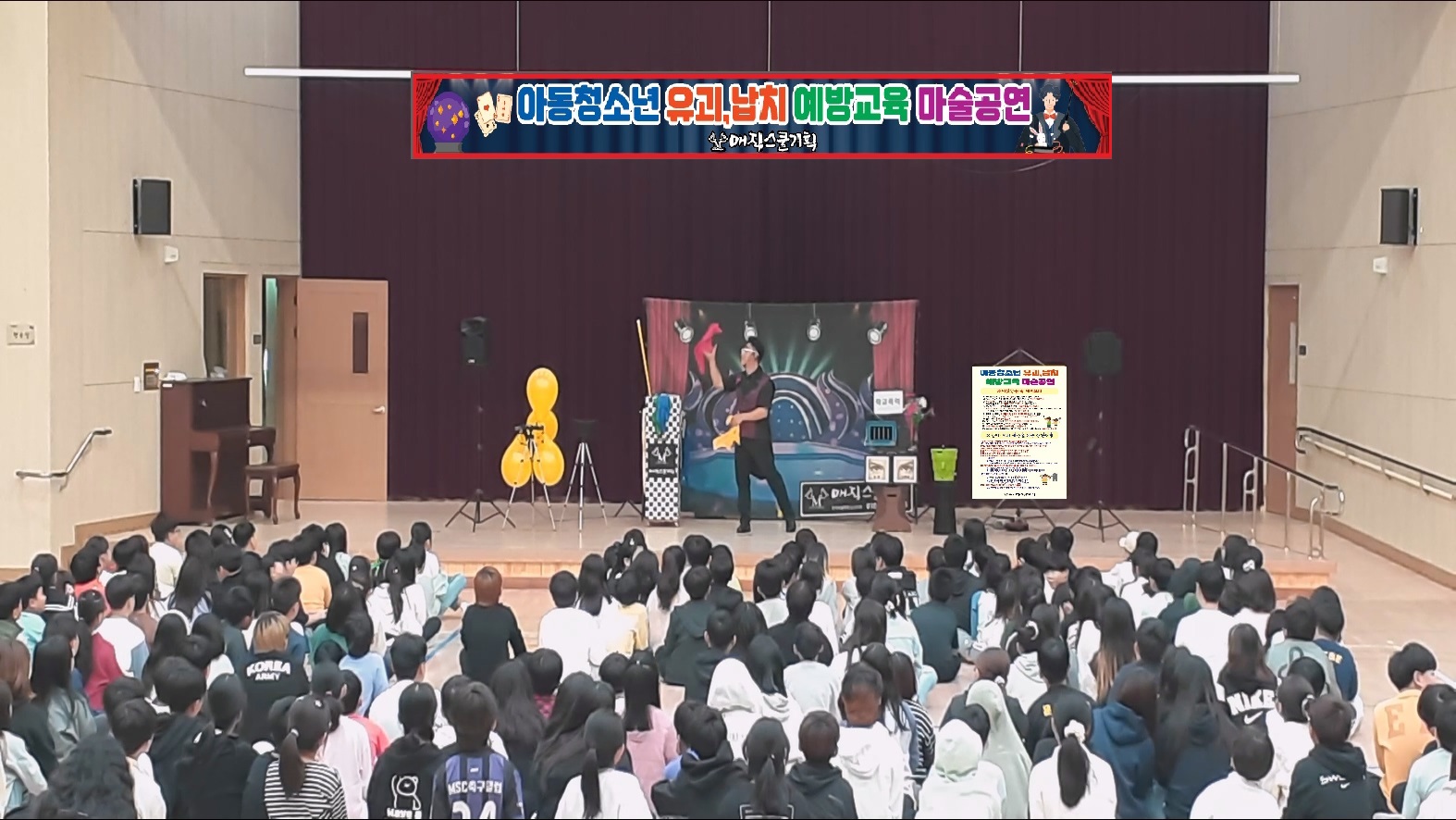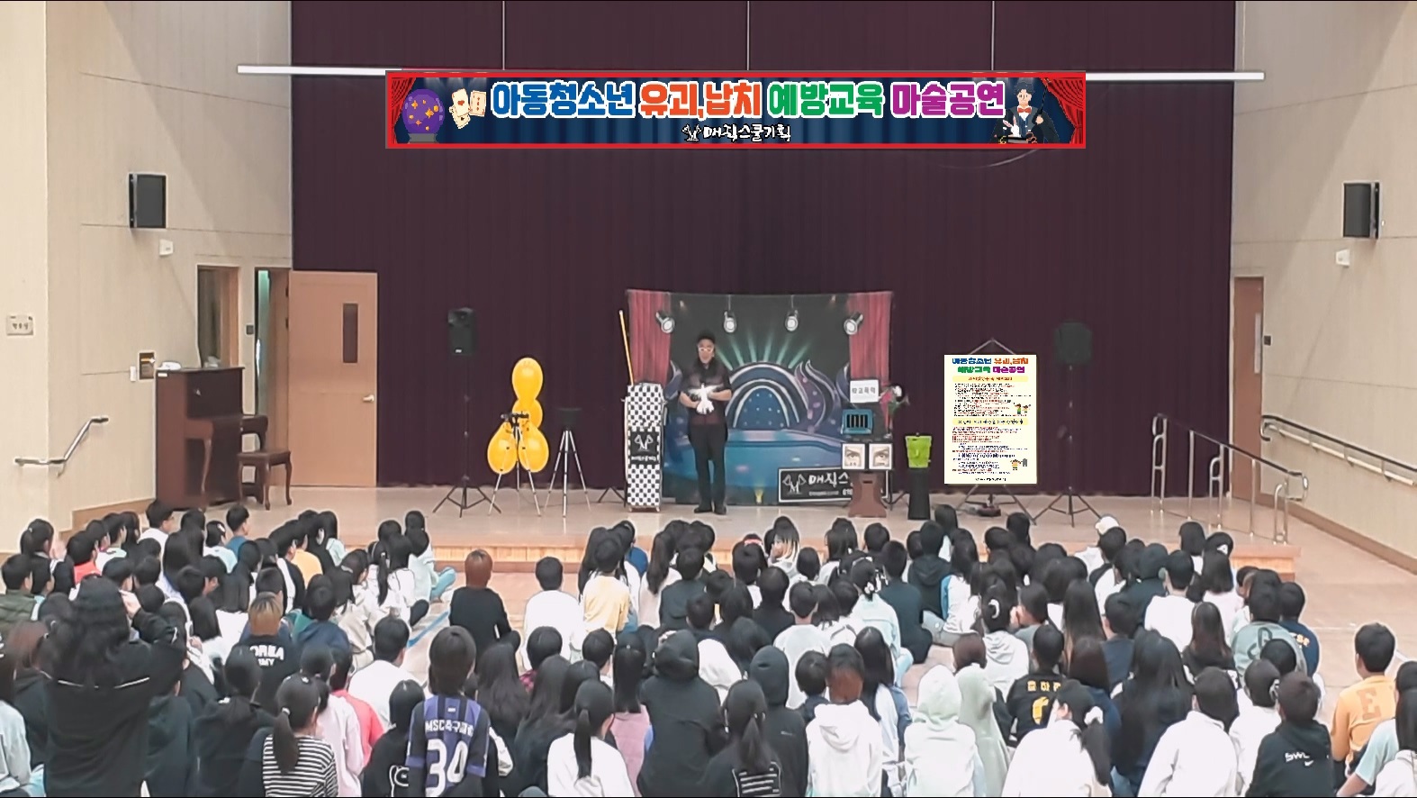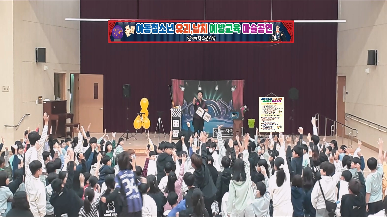 오늘 서울특별시 00초등학교 강당에서는 특별한 유괴,납치 예방교육 마술공연이 열렸습니다. 전교생을 대상으로 한 이번 행사는 학생들과 교사 모두에게 큰 호응을 받으며 성공적으로 마무리되었습니다.