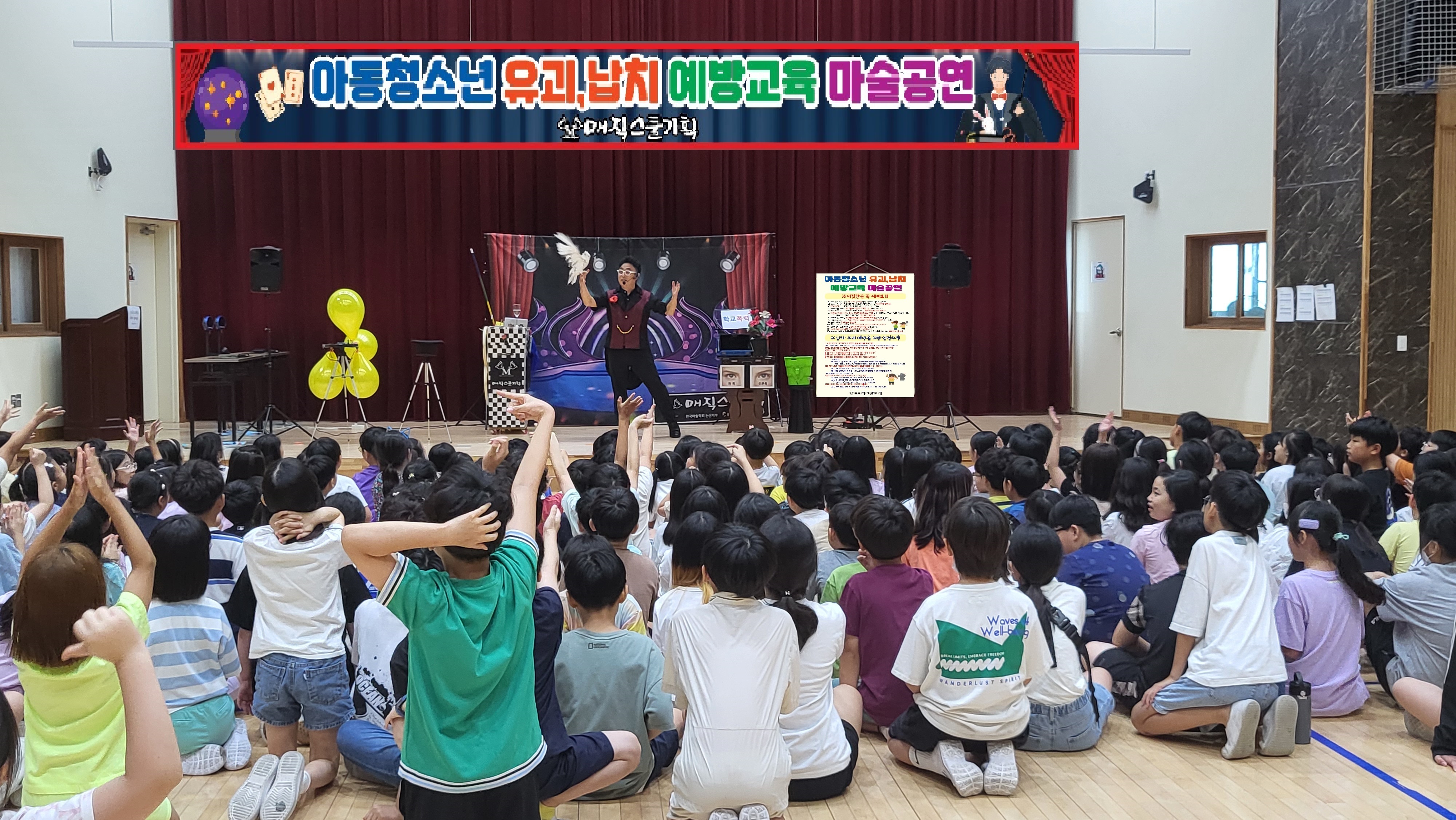오늘 전라남도 00초등학교 강당에서는 특별한 유괴,납치 예방교육 마술공연이 열렸습니다. 전교생을 대상으로 한 이번 행사는 학생들과 교사 모두에게 큰 호응을 받으며 성공적으로 마무리되었습니다.